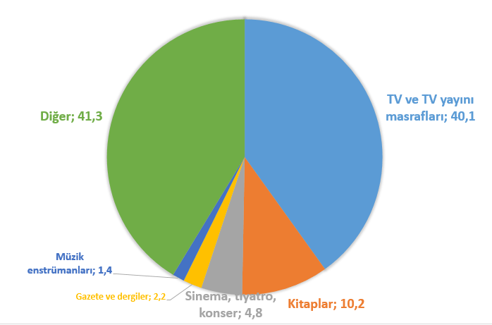 Gelelim hanehalkının kültür harcamalarına… 2016 yılında ortalama bir hanehalkı her 100 liralık kültür harcamasının 40,1 lirasını kablolu yayın hizmetleri de dahil olmak üzere televizyon ve televizyon yayın masraflarına ayırırken kitaplara 10,2 lirasını; sinema, tiyatro ve konser harcamalarına ise 4,8 lirasını ayırıyor. Gün içerisinde kültür aktivitelerine ayırdığı zaman içerisinde kitaplara ayırdığı zamanda cimri davranan bizler, konu harcamalara gelince de aynı cimriliği gösteriyor ne yazık ki. 2016 yılında ortalama bir bireyin gazete ve dergilere ayırdığı pay 0,3 puan gerilerken müzik enstrümanlarına ayırdığı pay ise 0,3 puan yükselerek yüzleri bir miktar güldürdü.